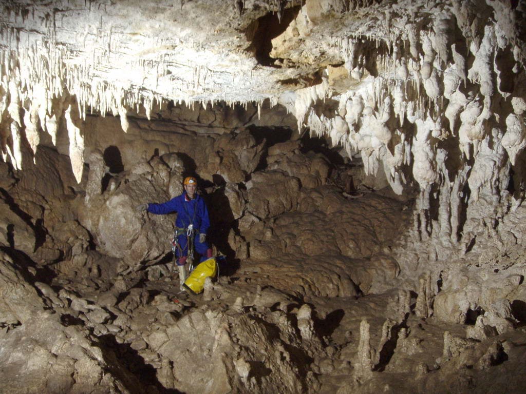 Continuamos por un paso un poco bajo que nos lleva a una gran galería, a la que accedemos descendiendo por un caos de bloques. Las dimensiones de esta galería son grandiosas en comparación del resto de la cavidad. Esta hace un giro de noventa grados para acabar en un pequeño lago y en una pequeña galería con una gatera impenetrable, junto al lago existe un sifón de barro (por donde se ha debido vaciar el lago) y otra pequeña galería con gours, también se aprecian el la parte alta de la sala final dos galerías que imaginamos sin explorar, por su elevada altura y por no haber visto ninguna instalación que nos sugiera una escalada artificial.
